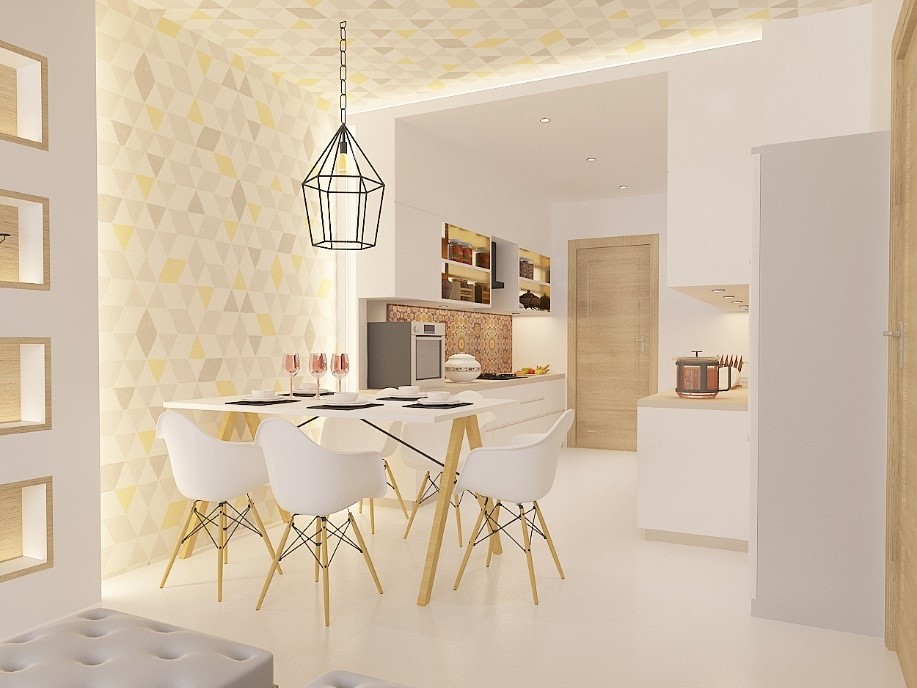 Have a complimentary design scheme for example have a similar color scheme for living & dining so that both the spaces look unified and gives a sense of spaciousness.